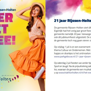 Vier het mee! De gemeente Rijssen-Holten viert dit jaar haar 21-jarige bestaan. Eigenlijk had het vorig jaar groot feest moeten zijn. In 2021 bestond de gemeente namelijk 20 jaar.Werkzaamheden Project Regge Pelmolen Rijssen